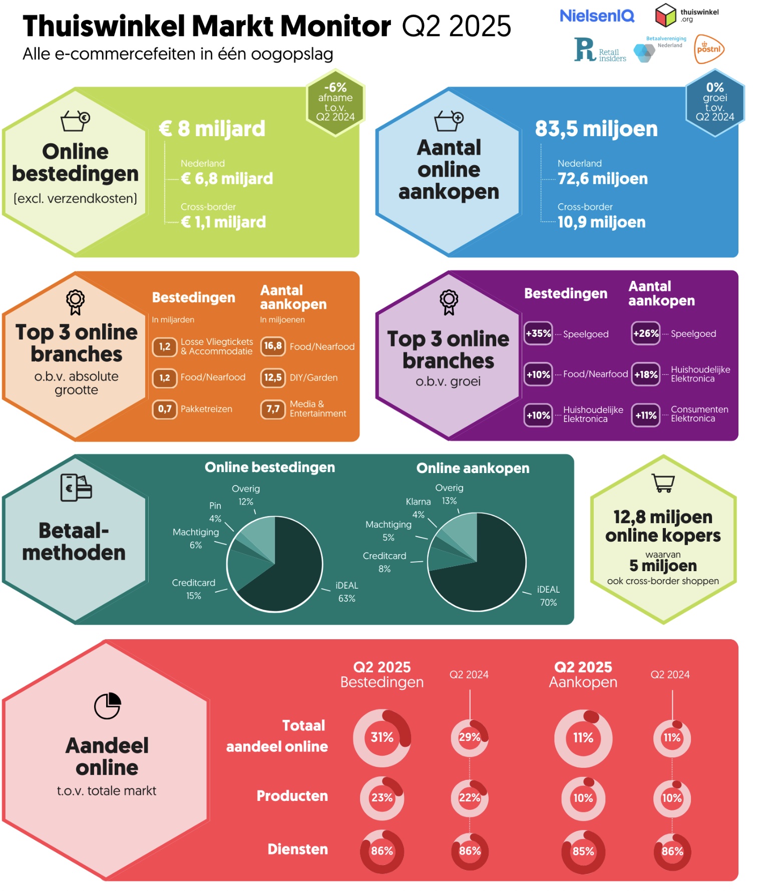 De Nederlandse e-commerce blijft groeien, maar wel vooral aan de productenkant. In het eerste halfjaar van 2025 gaven consumenten ruim € 17 miljard online uit, een daling van 1% ten opzichte van dezelfde periode vorig jaar. Die lichte terugval komt volledig voor rekening van diensten, waar de uitgaven met 7% daalden. De online verkoop van producten laat juist een duidelijke groei zien. Dat blijkt uit de Thuiswinkel Markt Monitor van Thuiswinkel.org en Retail Insiders, uitgevoerd door NielsenIQ.